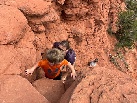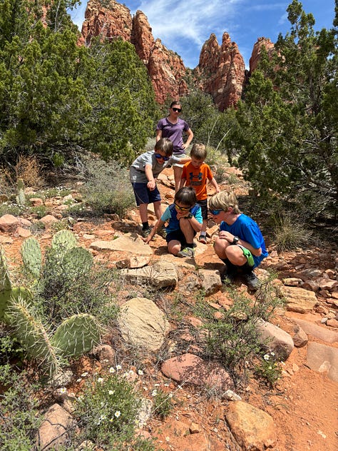 Our trek back to the car was fairly uneventful. The boys continued to try to catch lizards as we made our way by Juniper trees and dry stream beds. Once we got back to the car we decided to go uptown to see the shops at Sedona.