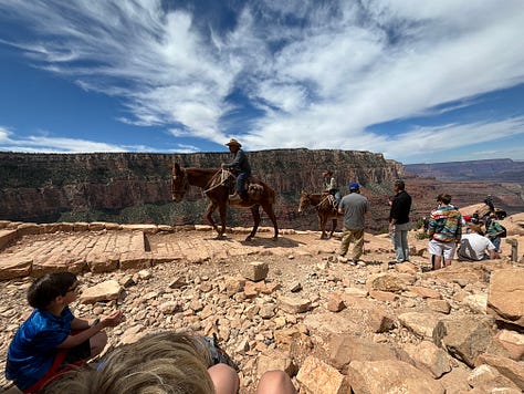 As we headed down the trail we let gravity take us and we pretty much ran down most of the way. We made it to Ooh Aah point. There were many other people around so we took our time and ate some snacks. We took a few pictures and enjoyed the view and people watching. As we sat there eating our snacks we heard many different people speaking in many different languages. At one point three people on mules passed by as they made their way up the trail.
