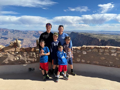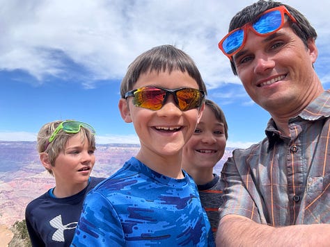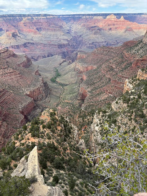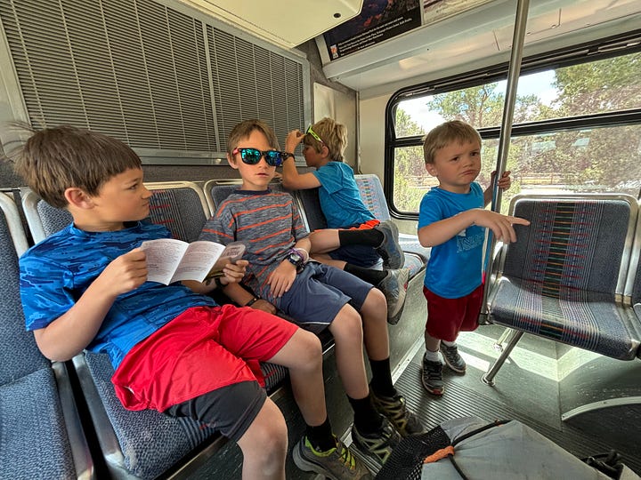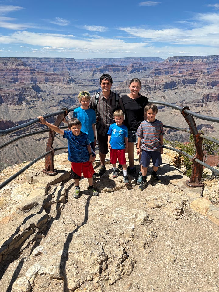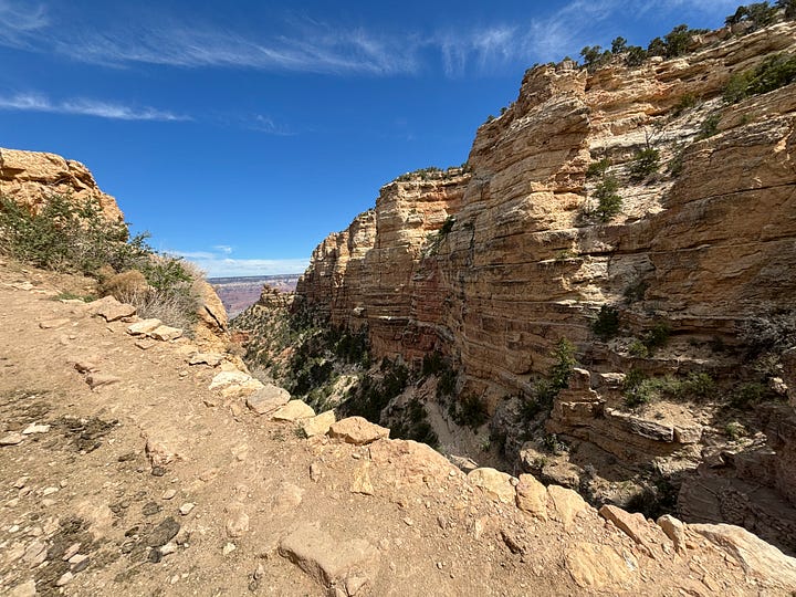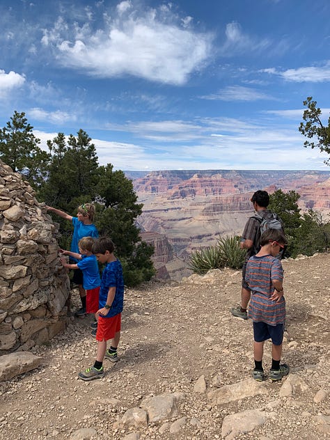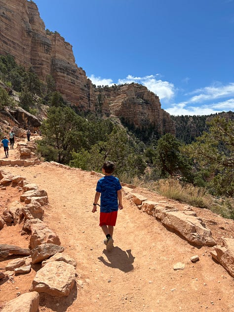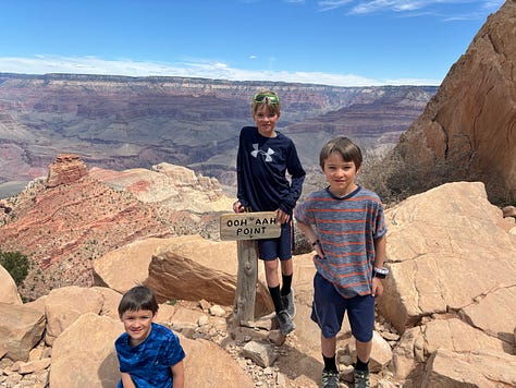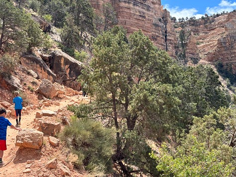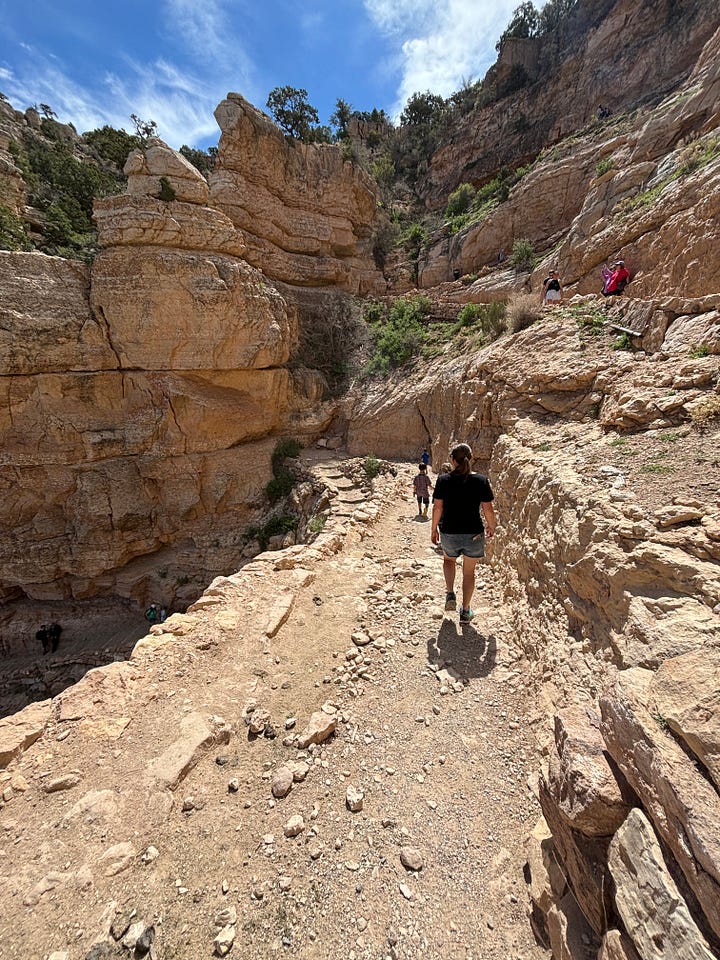 We got on the bus and headed to Yaki point. We looked out at the view and I thought we would be able to access the South Kaibab Trail from Yaki point but that was not the case. Instead we hiked back along the rim of the canyon to the South Kaibab Trailhead. We decided to try to hike down the South Kaibab Trail to Ooh Aah point. As we hiked down, our youngest started to feel some indigestion, pooping on our travels is definitely something to be prepared for! So, Korlissa volunteered to take him back up to the top of the trailhead to use the facilities, while I and our three oldest would proceed down the trail to Ooh Ahh point.