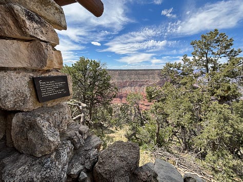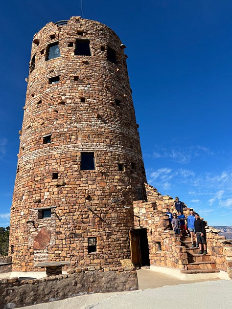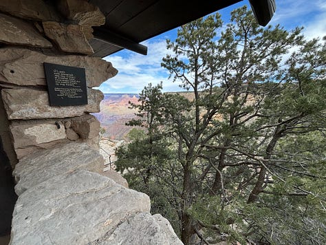 We made our way to Hermits Rest and ate more snacks and enjoyed relaxing a bit as we looked out at the canyon. We eventually started to head back toward the main visitor area but along the way we stopped at the Bright Angel Trailhead area. We walked along the rim of the canyon and stopped at the Lookout Studio where we could see some more views.