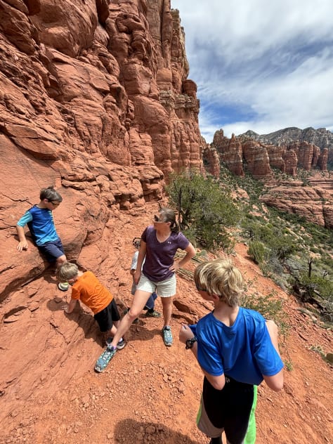 As we approached Snoopy Rock we started going steeper with a little bit of rock scrambling. We hiked along a big red rock on a ledge and then proceeded to go up again toward the red rocks above us. We then came to a rock wall which was pretty much the end of the trail. I climbed up the rock and peeked over the edge which dropped off the other side looking out toward a vast open view of more amazing red and multicolored rock formations in the distance. We were able to get everyone a look over the edge to see the views from the top. It was dizzying looking up at the giant columns of red rock above us.